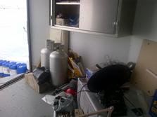 The Calgary Space Workers strive to expand as we reach forward and acquire a 27 foot cargo trailer. This cargo Trailer has a propane heater and wall mounted stainless steel cabinets. The design is the "V"- Nose front with the front ramp door, a man door on the side and another ramp door at the rear. The Cargo trailer was originally designed to hold cars and now will be the second hard shell unit that is to become the mechanical room and the shop. It is to become the mechanical room that contains the power plant equipment to both cool and heat the analog lunar habitat. It is to become the shop that allows us to make and repair parts of the plant that allow it to maintain its life support system. We at the Calgary space workers look forward to making the future of our analog lunar habitat a great success